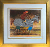 An etching begins with a metal plate (usually copper) that has been coated with a waxy substance called a “ground”. Pro Hart would then create his composition by drawing through the ground to expose the metal. The plate is then immersed int he acid bath, which “bites” or chemically dissolves the exposed lines. For printing, the ground is removed, ink is introduced int he the incised lines, and the plate is wiped clean. The plate is covered with a dampened paper and run through a press under great pressure in order to force the paper into the lines, resulting in the raised characteristic of etching. To create the colour each etching is then hand painted.